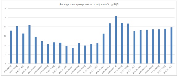 Nëse e shohim këtë grafik, është e qartë se ndarjet financiare për kërkim dhe zhvillim gjatë gjithë periudhës nga viti 1997 deri në vitin 2023 (periudhë për të cilën ka të dhëna në bazën World Bank Data) janë të ulëta.