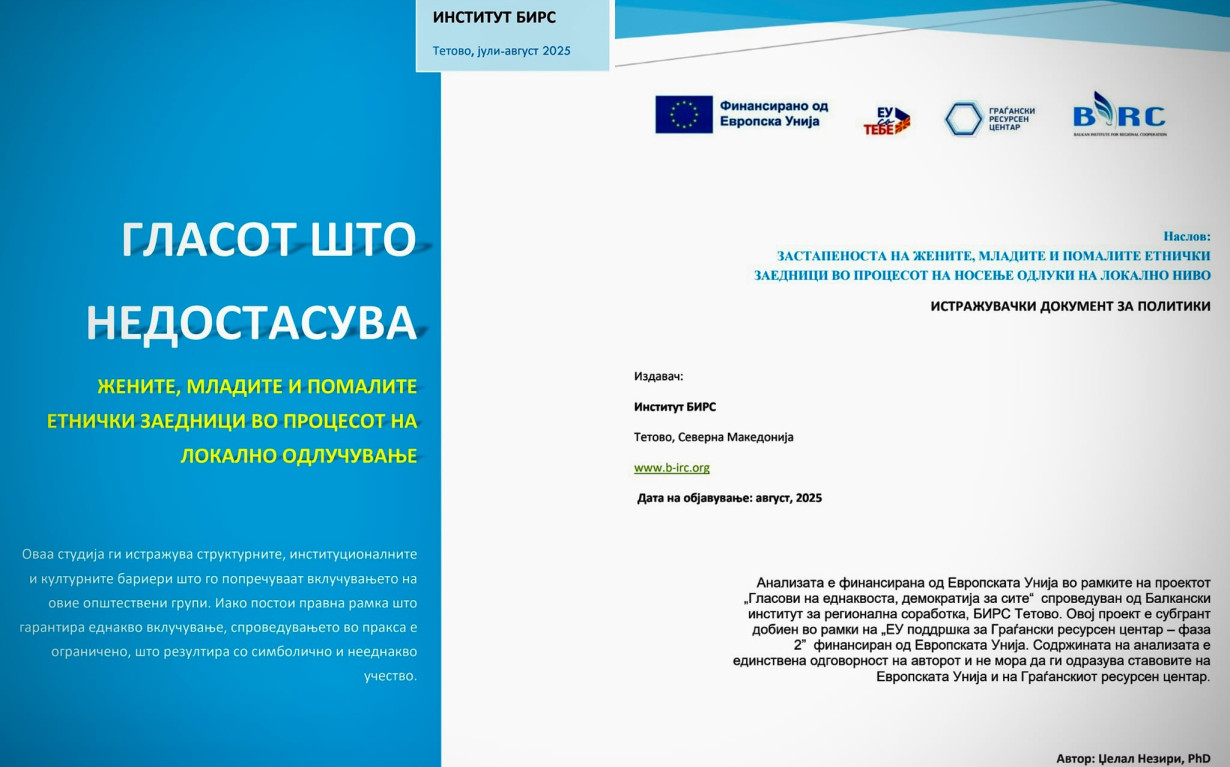 Од најновото истражување „Застапеноста на жените, младите и помалите етнички заедници во процесот на одлучување на локално ниво“, спроведено од Институтот BIRC, во рамки на проектот „Гласовите на еднаквоста, демократија за сите“, финансиран од Европската Унија, произлегува дека жените, младите и помалите етнички заедници продолжуваат да бидат маргинализирани во локалното одлучување. Иако постоечките закони гарантираат еднакво вклучување, нивната примена во пракса често останува формална и симболична, претворајќи се во недоволна претставеност без реално влијание.
