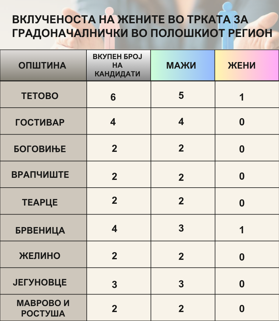 Во Полошкиот регион, сепак, учеството на жените во трката за локални извршни позиции останува на ниско ниво. Од деветте општини во регионот, само две имаат жени кандидатки за градоначалнички, додека во останатите седум исклучиво се натпреваруваат мажи.