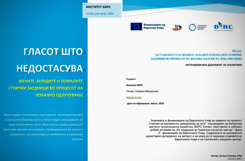 септември 2, 2025 ShareFacebookTwitter-new ГЛАСОТ ШТО НЕДОСТАСУВА, ЖЕНИТЕ, МЛАДИТЕ И МАЛИТЕ ЕТНИЧКИ ЗАЕДНИЦИ СÈ УШТЕ НАДВОР ОД ЛОКАЛНОТО ОДЛУЧУВАЊЕ Од најновото истражување „Застапеноста на жените, младите и помалите етнички заедници во процесот на одлучување на локално… Continue Reading